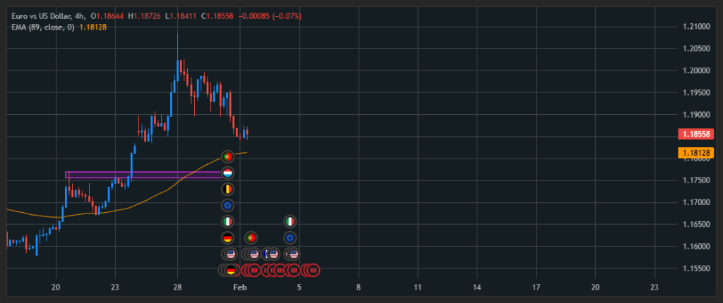 On the H4 chart, EUR/USD remains in a broader bullish structure after the previous strong upside move. Price is currently pulling back and trading very close to the EMA 89 dynamic support zone.