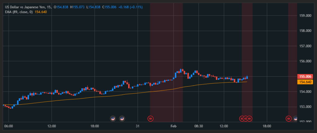 On the M15 timeframe, USD/JPY is trading in alignment with the H1 structure above EMA 89. Pullbacks toward EMA 89 on this timeframe may offer tactical entry opportunities.