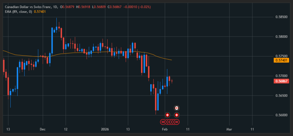 Looking at the daily (D1) chart, CAD/CHF remains in a broader downtrend after decisively breaking below the EMA 89 in the past.