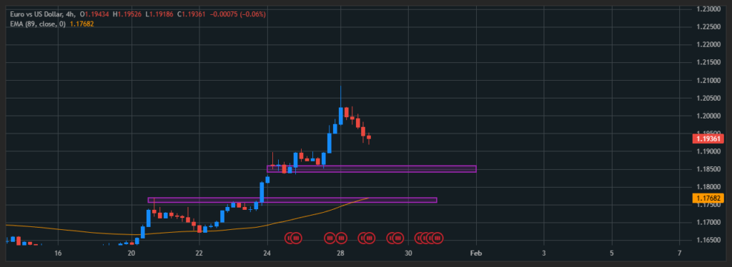 On the H4 timeframe, EUR/USD is currently experiencing a technical pullback after a strong bullish move toward the 1.2100 area. Despite this correction, the overall market structure remains bullish, as price continues to trade above the EMA 89, indicating that the uptrend is still intact rather than a trend reversal.